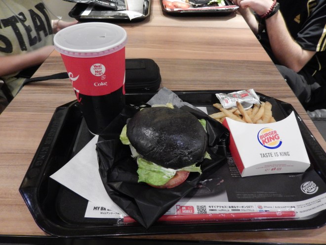 Zum Abend (24.09.2014) bin ich mit einer Gruppe aus dem Studentenwohnheim mit der Bahn nach Sannomiya gefahren, um zum Burger King zu gehen. Erst einmal ist das nichts besonderes. Es gab zu diesem Zeitpunkt einen ganz speziellen Burger, nämlich den „Kuro Diamond Burger“.