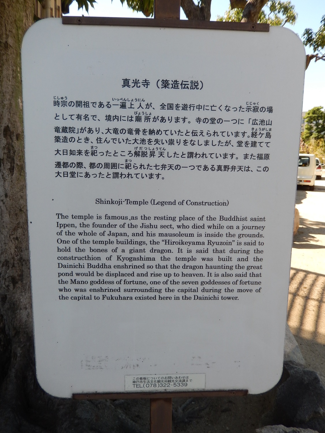 So langsam bekam ich Hunger und suchte mir einen Platz, um mein Proviant zu essen. Ich fand ein schattiges Plätzchen in einem kleinen Park. Beim Essen merkte ich, dass ich mich in der Nähe eines Tempels aufhielt. Als ich fertig mit meinem Essen war, schaute ich mir den Shinkoji Tempel an. Auf einer Infotafel (siehe Abbildung) stehen einige Details über den Tempel drauf.