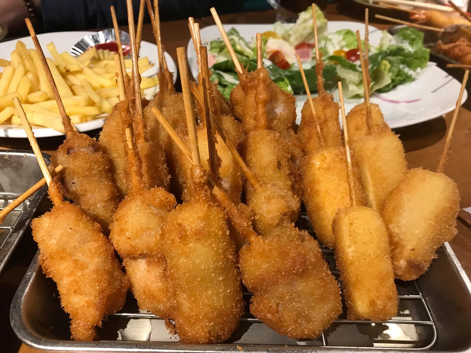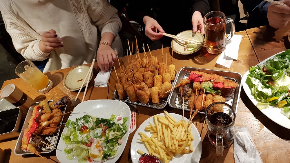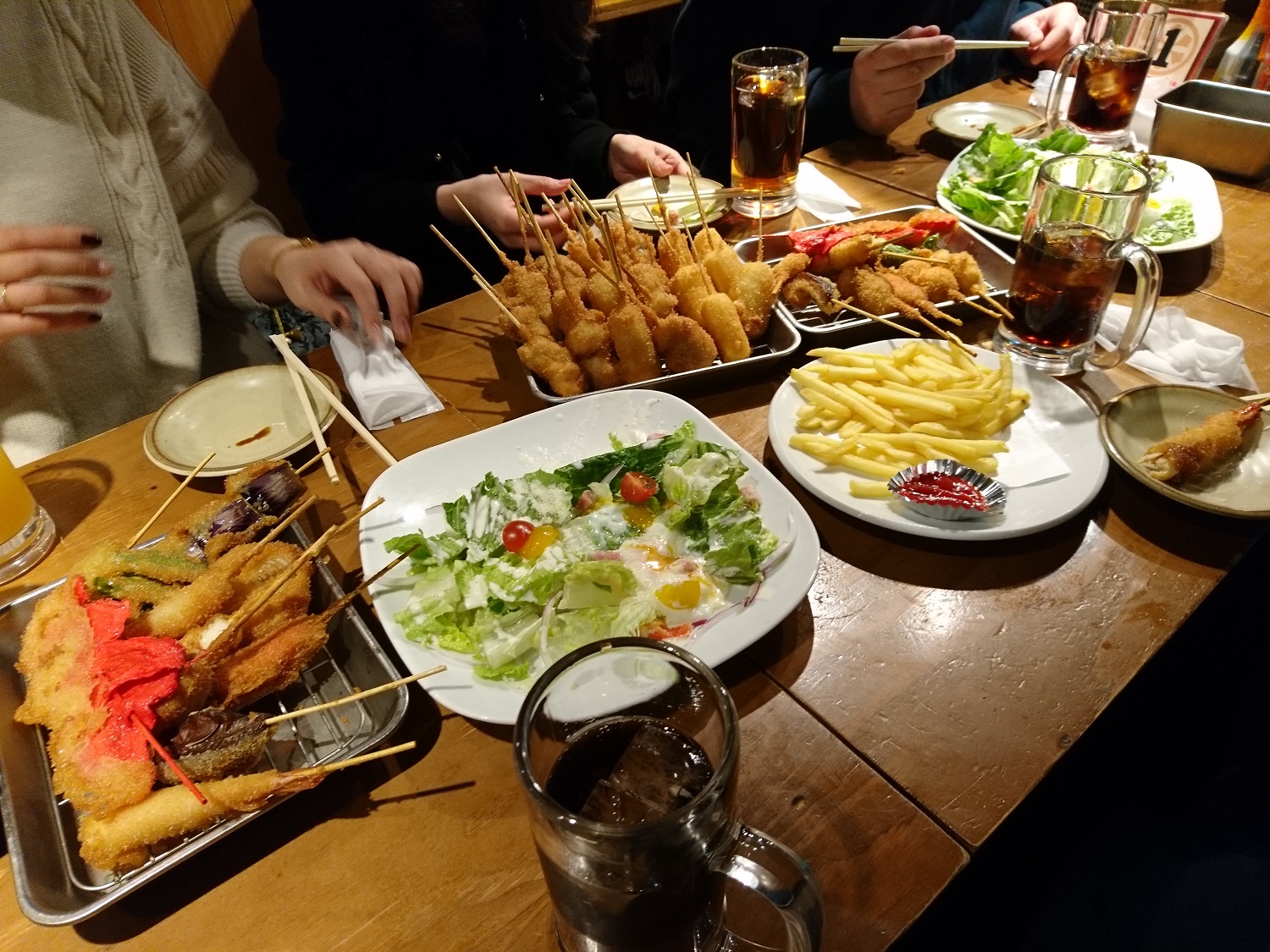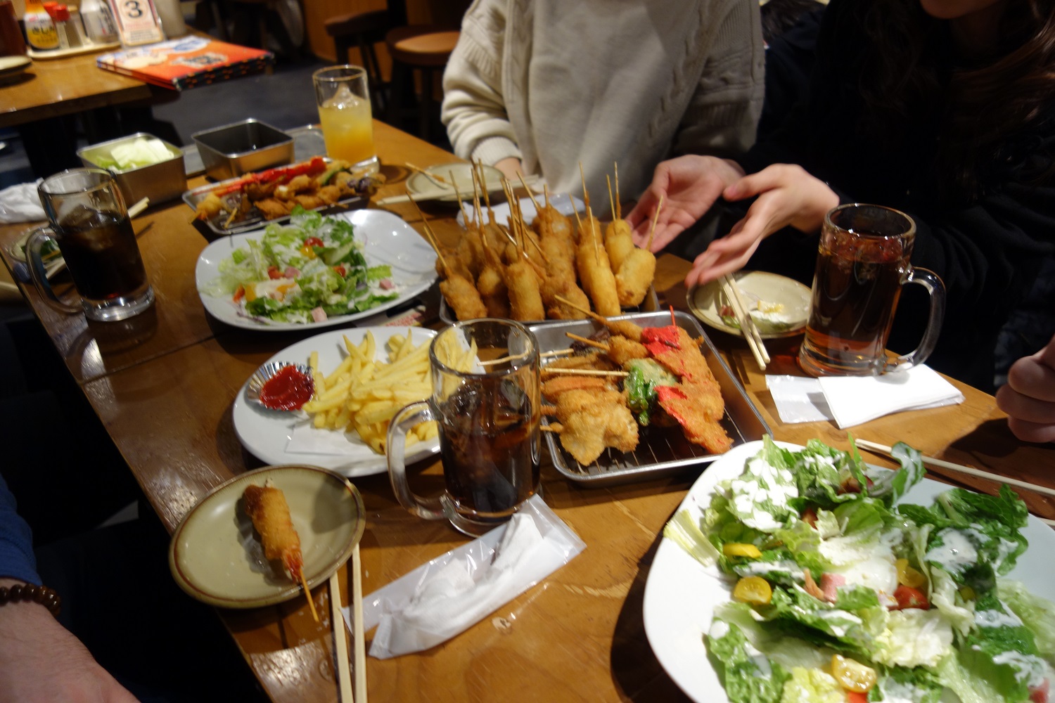 Es gab zum Mittag „Kushikatsu“. Das Gericht wurde in den 1930ern in Osaka entwickelt. Kushikatsu sind im Paniermehl frittierte Fleisch-, Fisch- und Gemüse-Spießchen. Es gibt noch andere Varianten z.B. mit Käse. Die panierten Spieße werden in einen Behälter mit einer speziellen Soße getunkt. Aus hygienischen Gründen werden die Spieße nur einmal in den Soßenbehälter getaucht. Wir wollten zum Restaurant „Kushikatsu-Daruma“, leider war ist nicht einfach, einen Tisch für 6 Personen zu bekommen. Deshalb haben wir uns ein anderes Restaurant gesucht mit mehr Platz. Das Einzige was etwas genervt hat war das Rauchen im Restaurant, aber sonst war der Laden und Essen echt gut und wir wurden von Hono und Hinano zum Essen eingeladen 🙂