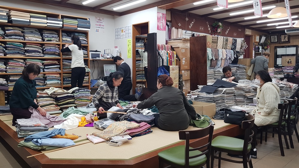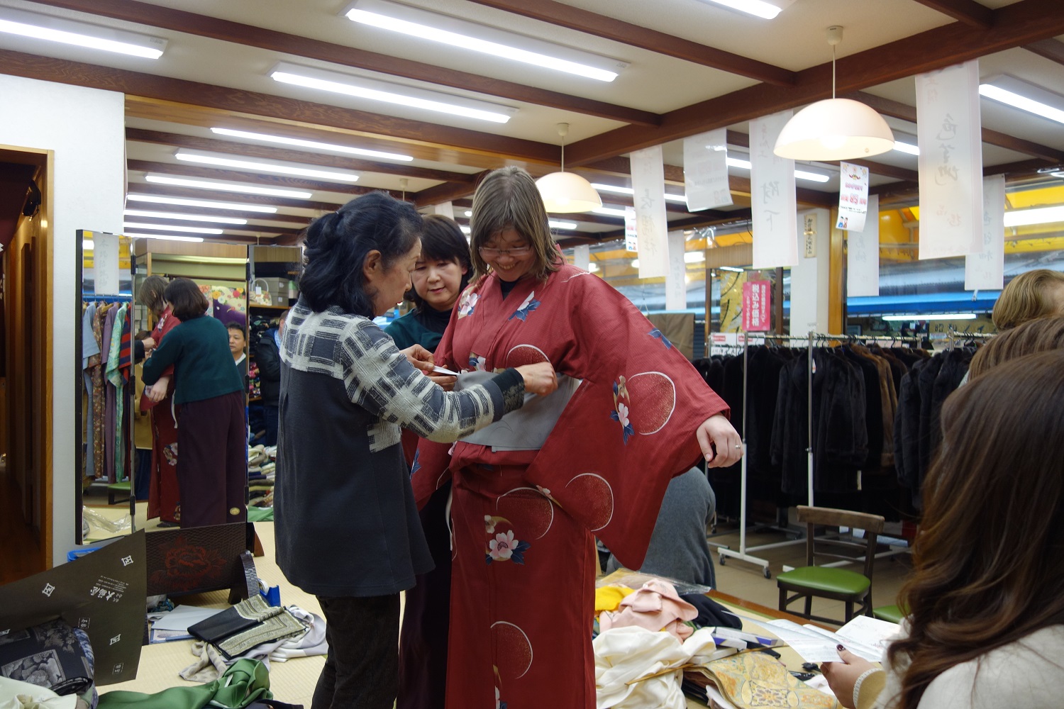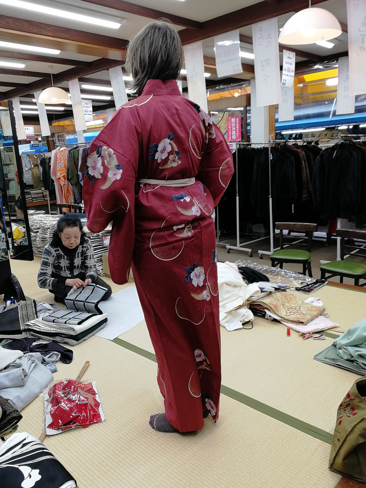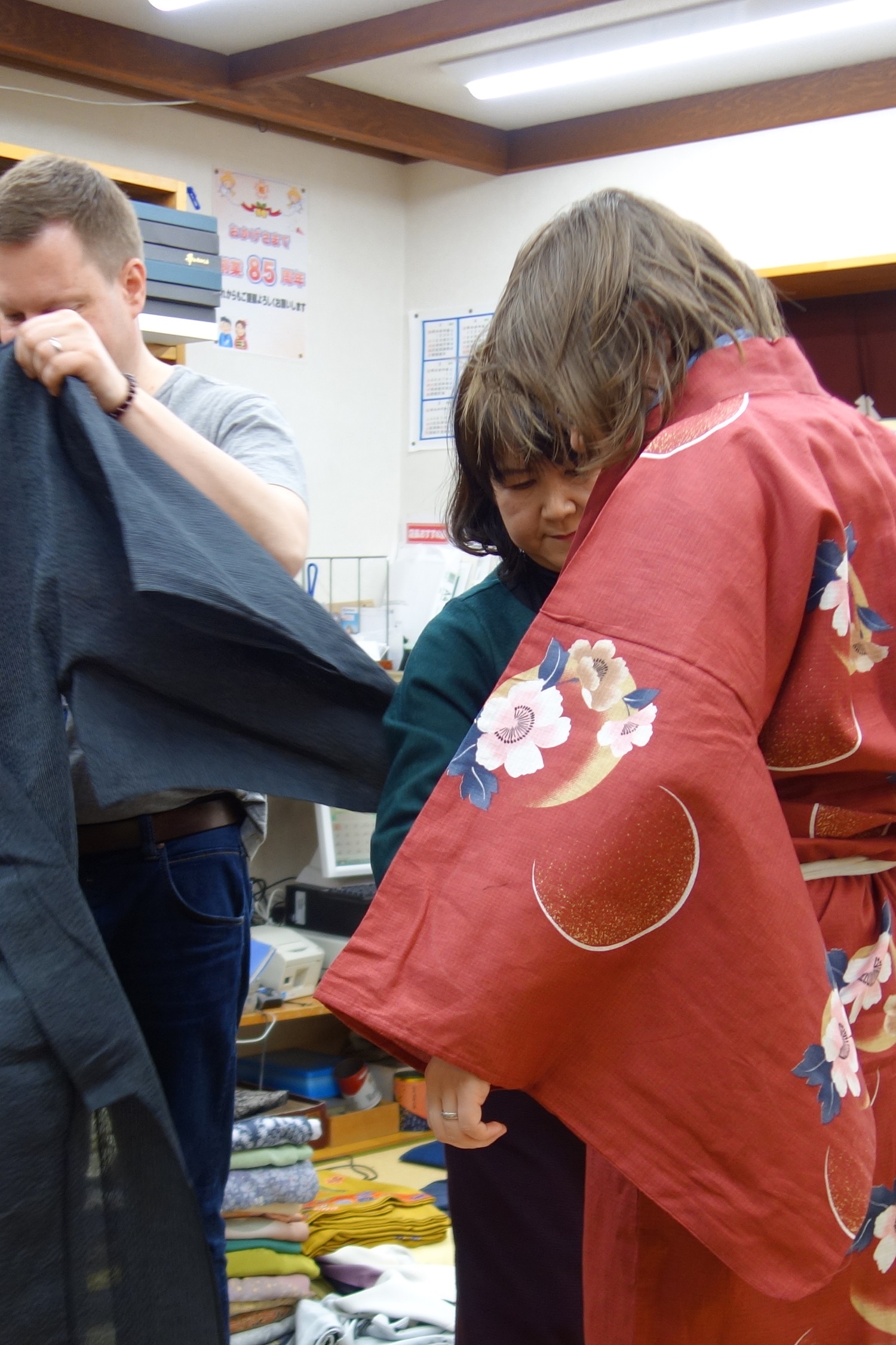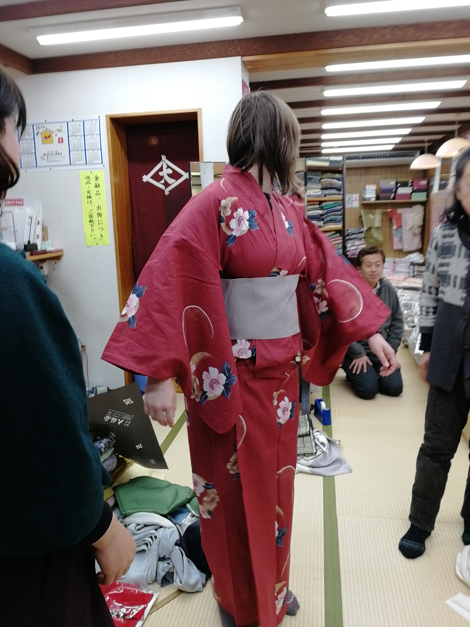 Es gab die Überlegung, einen Yukata zu kaufen, aber wir wussten nicht so richtig, wo wir einen Yukata kaufen können. Meine Freundinnen haben sich sofort an die Arbeit gemacht und angefangen im Internet zu recherchieren. Im ersten Laden wurde uns mitgeteilt, dass gerade keine Yukatas angeboten werden, da gerade keine Saison ist. Das nächste Geschäft hatten zu unserem Glück noch einige Yukatas. Der Laden war echt toll und wir hatten alle unseren Spaß 🙂 Hinano und Hono haben uns bei der Übersetzung geholfen und mich auch etwas Beraten, welchen Yukata ich nehmen sollte. Aber seht selbst ^^