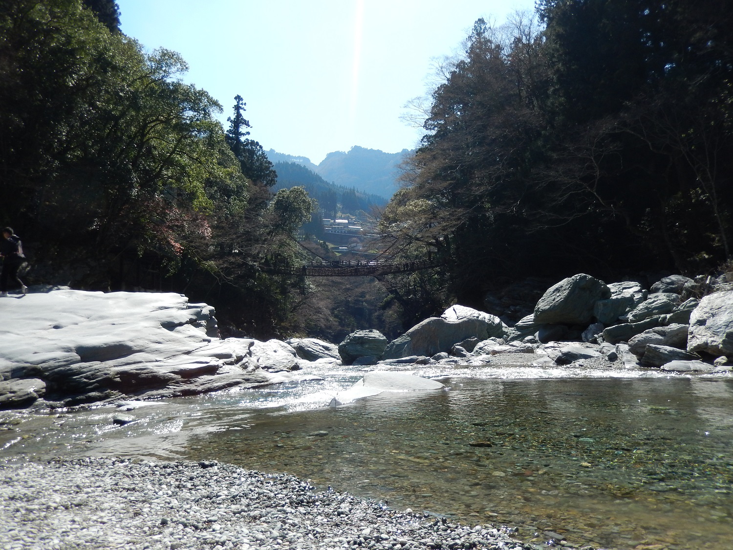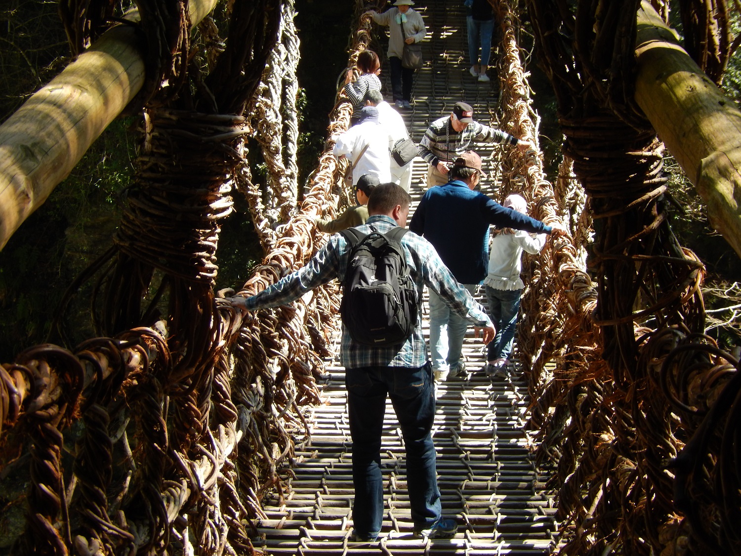Angekommen mussten wir noch ein kurzes Stück laufen. Der Weg zur Brücke war leicht zu finden, da der Weg gut ausgeschildert war. Um die Brücke zu überqueren wurde ein Eintrittspreis von 550 Yen von uns verlangt. Nach Bezahlung des Eintrittspreises wagten drei von uns den Weg über die Brücke. Wer Höhenangst hat, sollte sich die Überqerung genau überlegen, da der Abstand zwischen den einzelnen Fußtritten doch größer ist als gedacht.