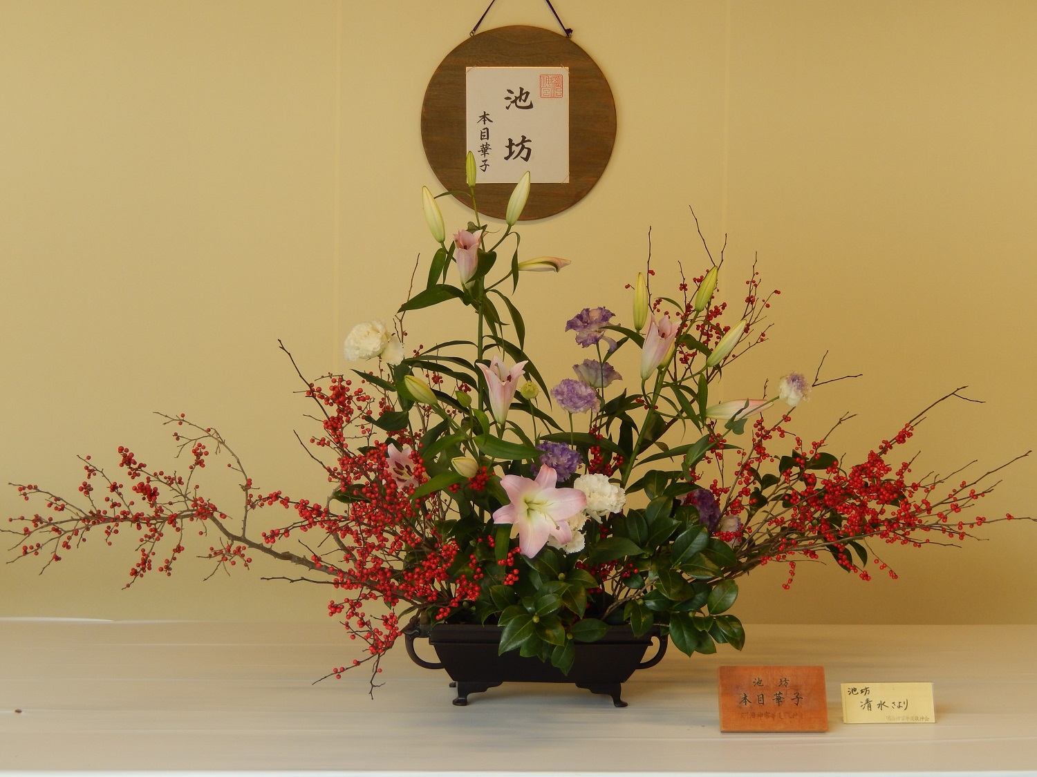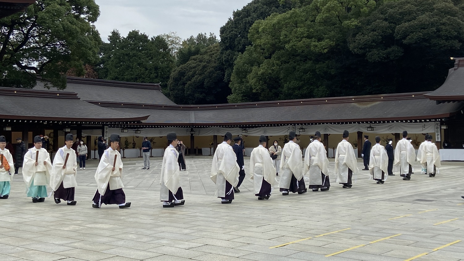 Nach der Internetseite des Schreins sollte an diesem Tag das Herbstfest stattfinden. Dieses Fest geht normalerweise vom ersten bis zum dritten November. Durch Corona hat das Fest wahrscheinlich nicht so stattgefunden wie üblich. Es sollten nämlich Vorführungen zum Bogenschießen oder Schwertkampf stattfinden. Als wir angekommen sind, gab es solche Vorführungen nicht, sondern es wurden Blumenarrangements „Ikebana“ ausgestellt. Zudem wurden Essen- und Getränkespenden für den Meiji Schrein unter Nennung der Spender ausgestellt.