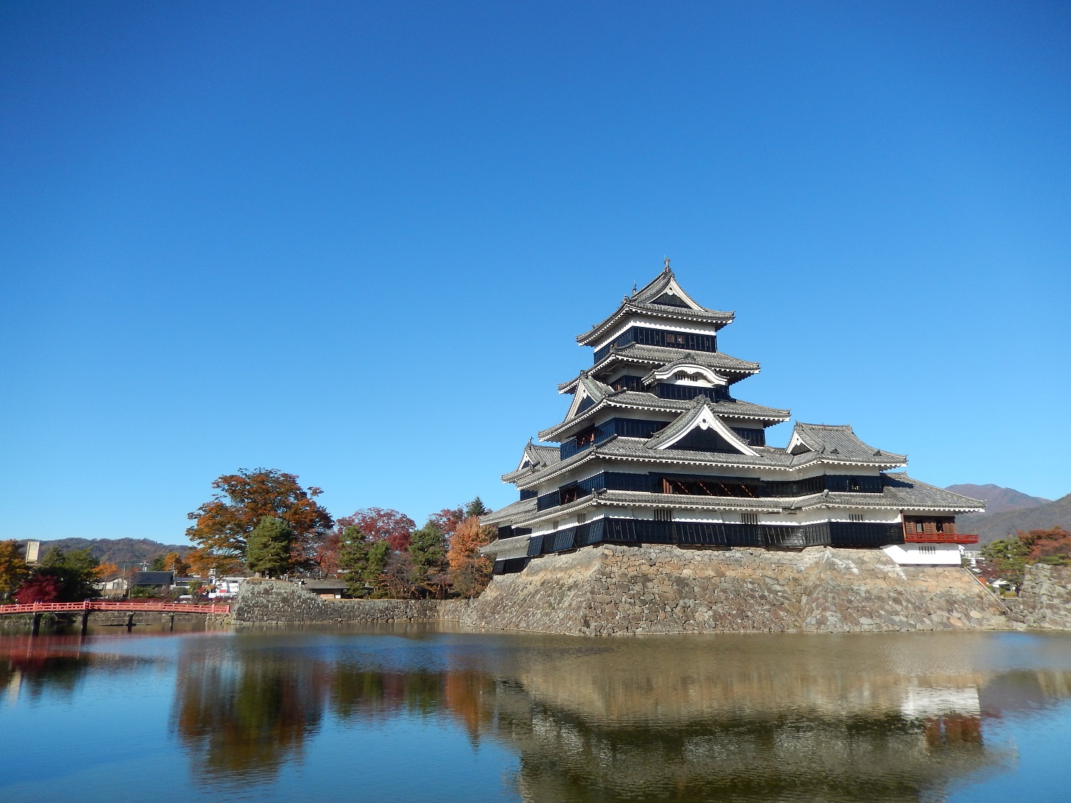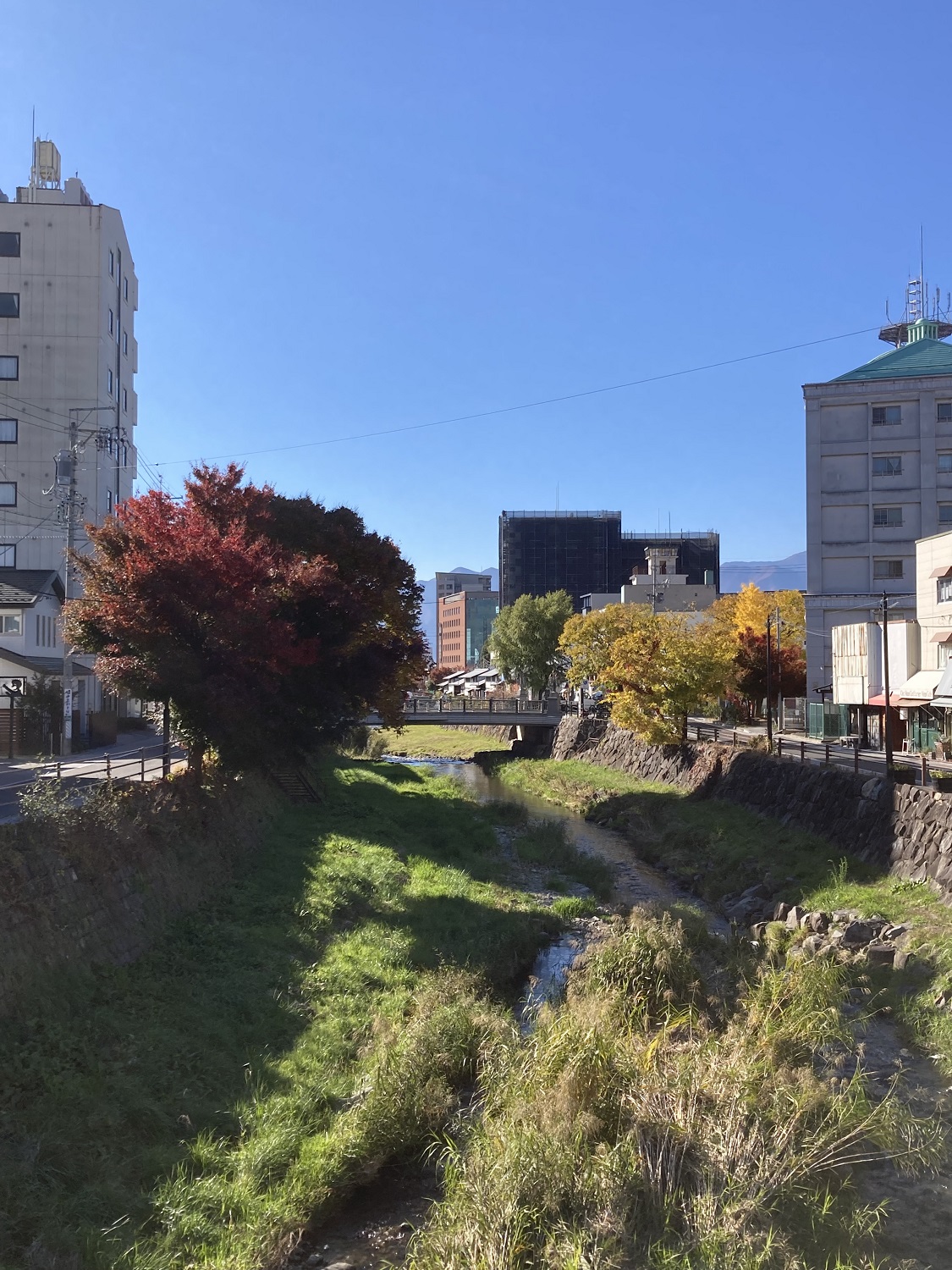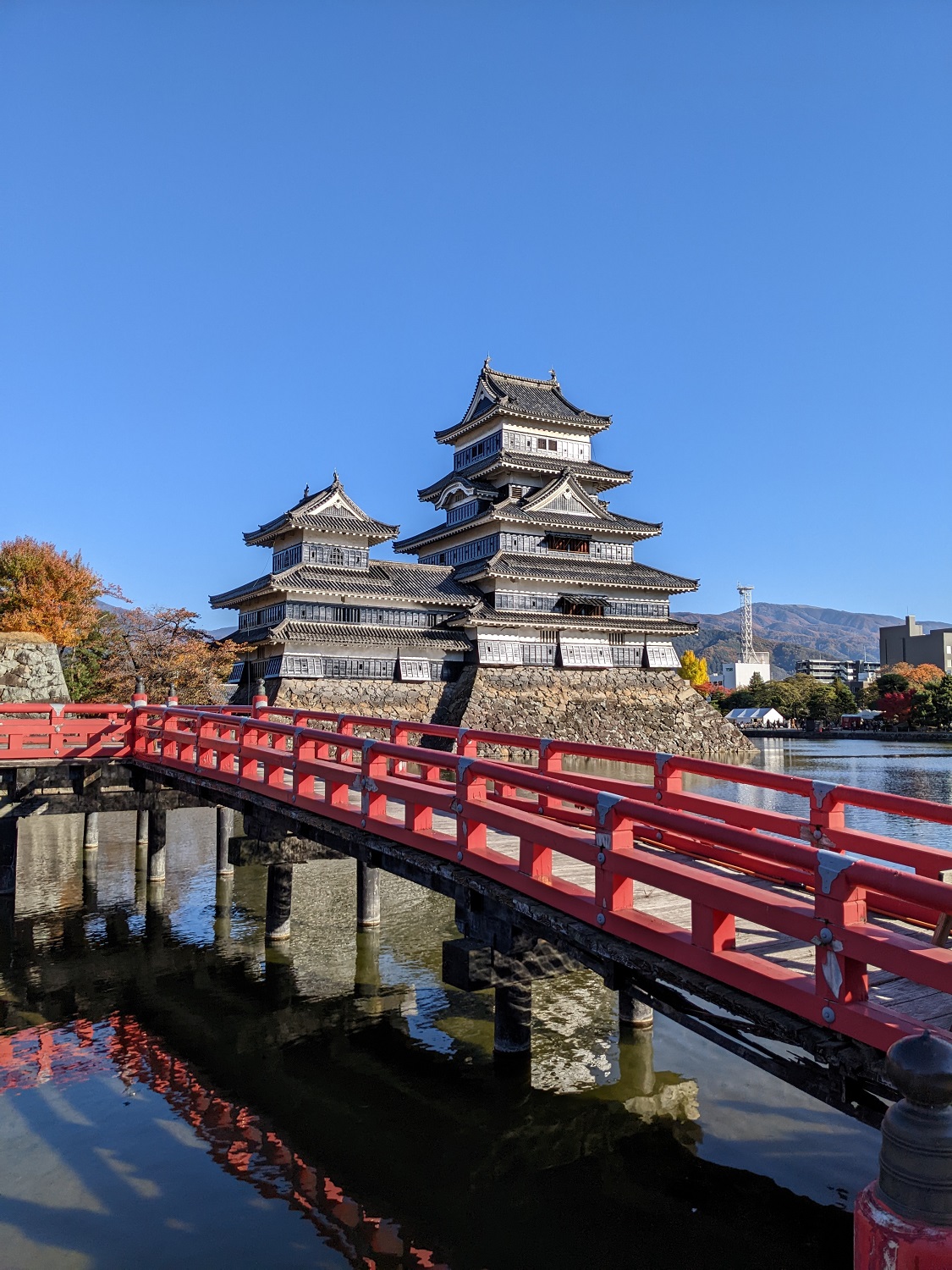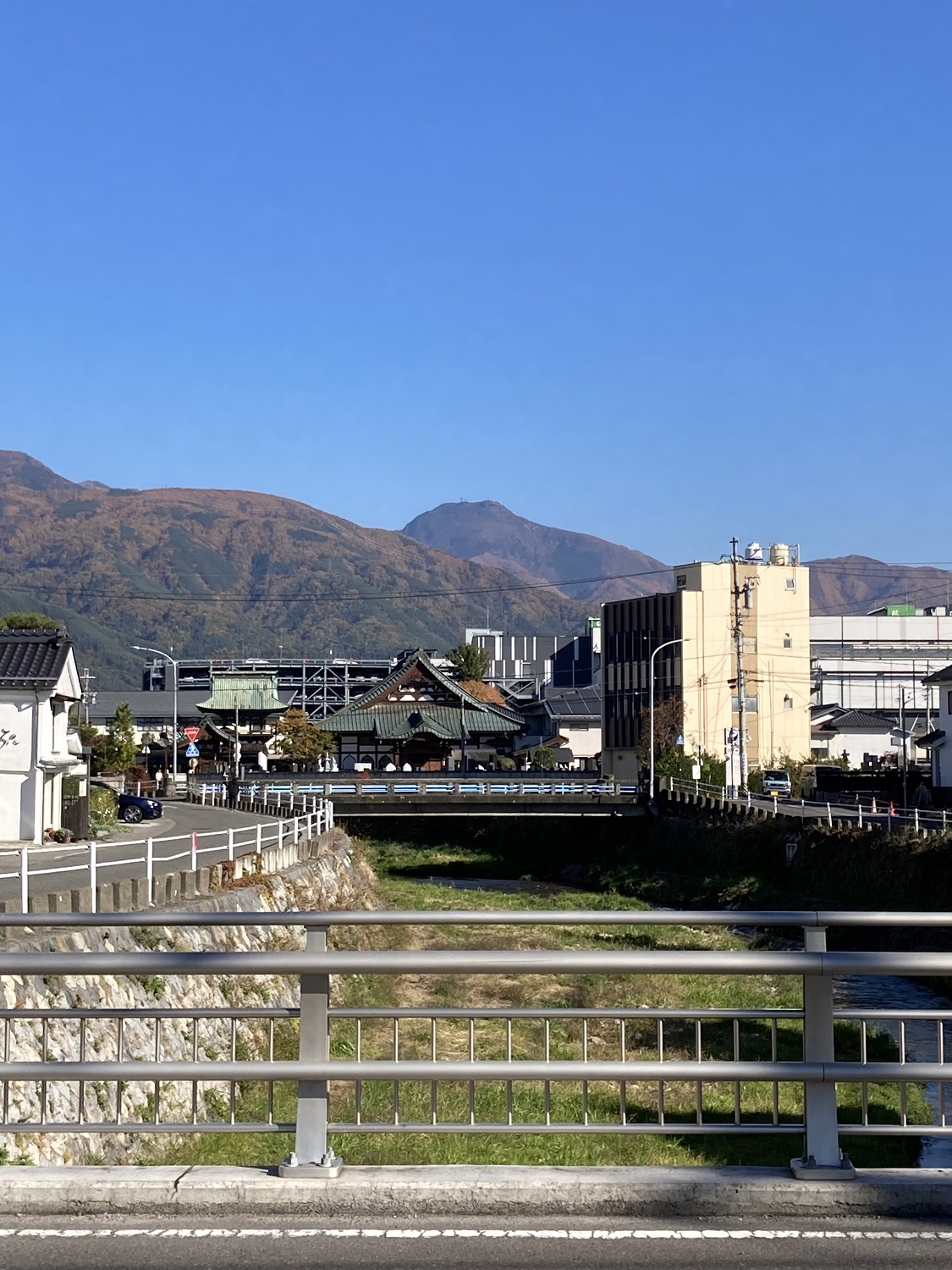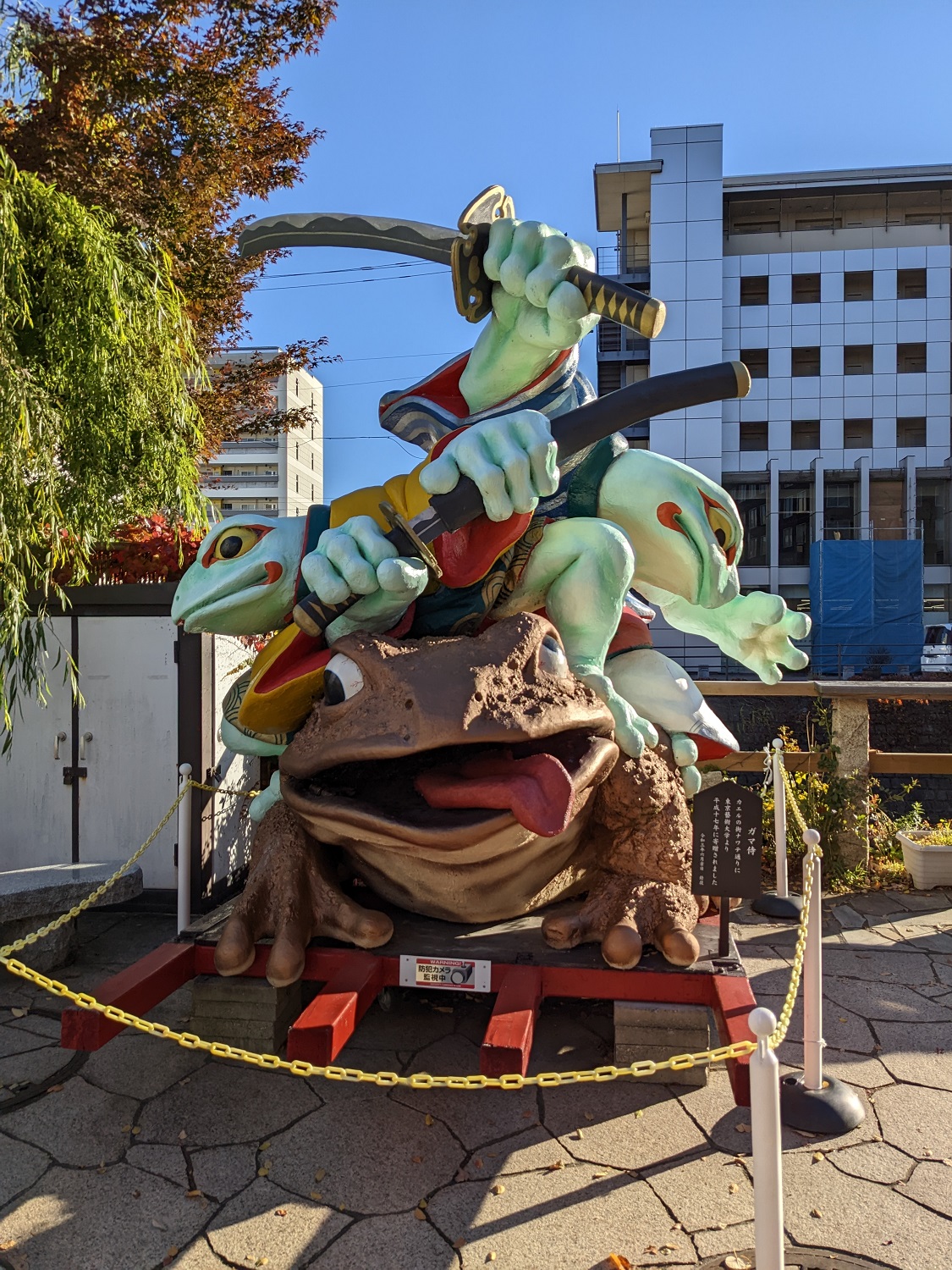 Durch die wunderschöne Herbstlaubfärbung und den strahlenden blauen Himmel wirkte die Stadt sehr malerisch. Wir besuchten einen lokalen Schrein namens Yohashira. Hier sahen wir auch einen älteren Mann mit drei weißen Kaninchen in der Nähe des Flusses. Dieser führte anscheinend seine Kaninchen Gassi. Um den Schrein gibt es auch viele kleine Geschäfte. Da der Frosch in Matsumoto sehr beliebt ist, findet man diesen auch in den Läden. Ein Frosch wurde definitiv für zu Hause mitgenommen.