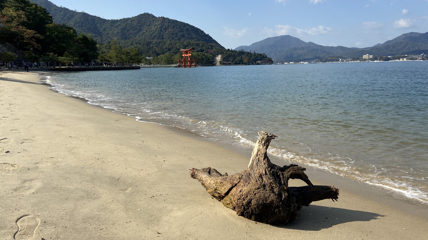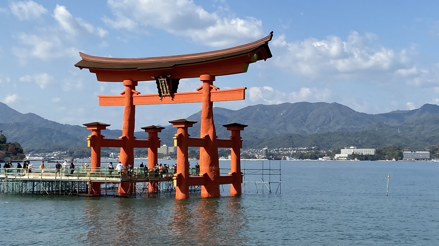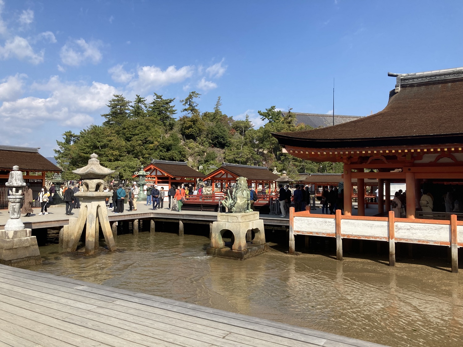 Wir besuchten als erstes den Itsukushima Schrein mit dem wunderschönen Torii. Das Torii wurde vor kurzem saniert und wieder für die Öffentlichkeit freigegeben. Deshalb sieht man noch einen Steg, der zum Torii führt.