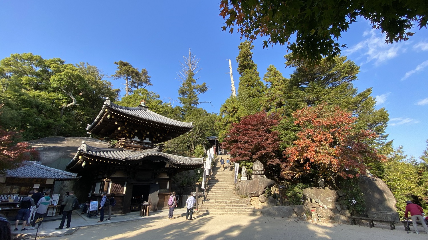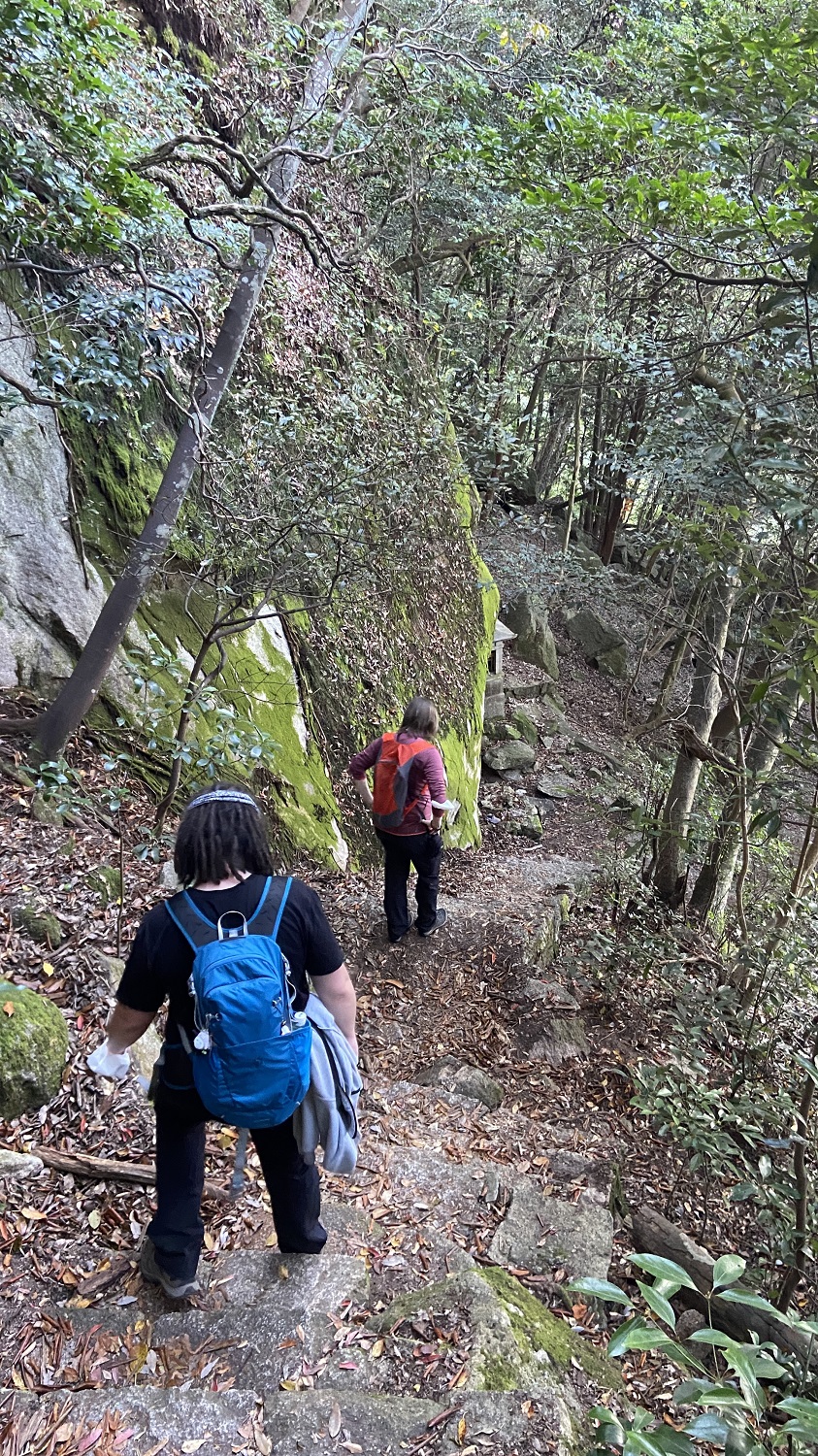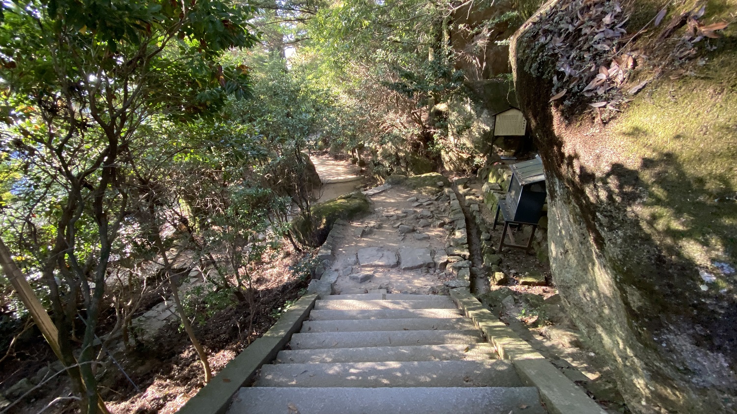 Den Abstieg machten wir zu Fuß. Dieses Mal nahmen wir einen anderen Weg nach unten als bei der Reise 2017 (Link zum Artikel: Sommerreise 2017 nach Miyajima). Es war unglaublich ruhig und friedlich. Auch gab es auf dem Weg viel zu entdecken. Die vielen Stufen nach unten dürfen natürlich nicht fehlen. Das gibt bestimmt Muskelkater! Unten angekommen kauften wir noch etwas ein und holten uns einen kleinen Snack. Danach ging es zur Fähre und zurück aufs Festland.