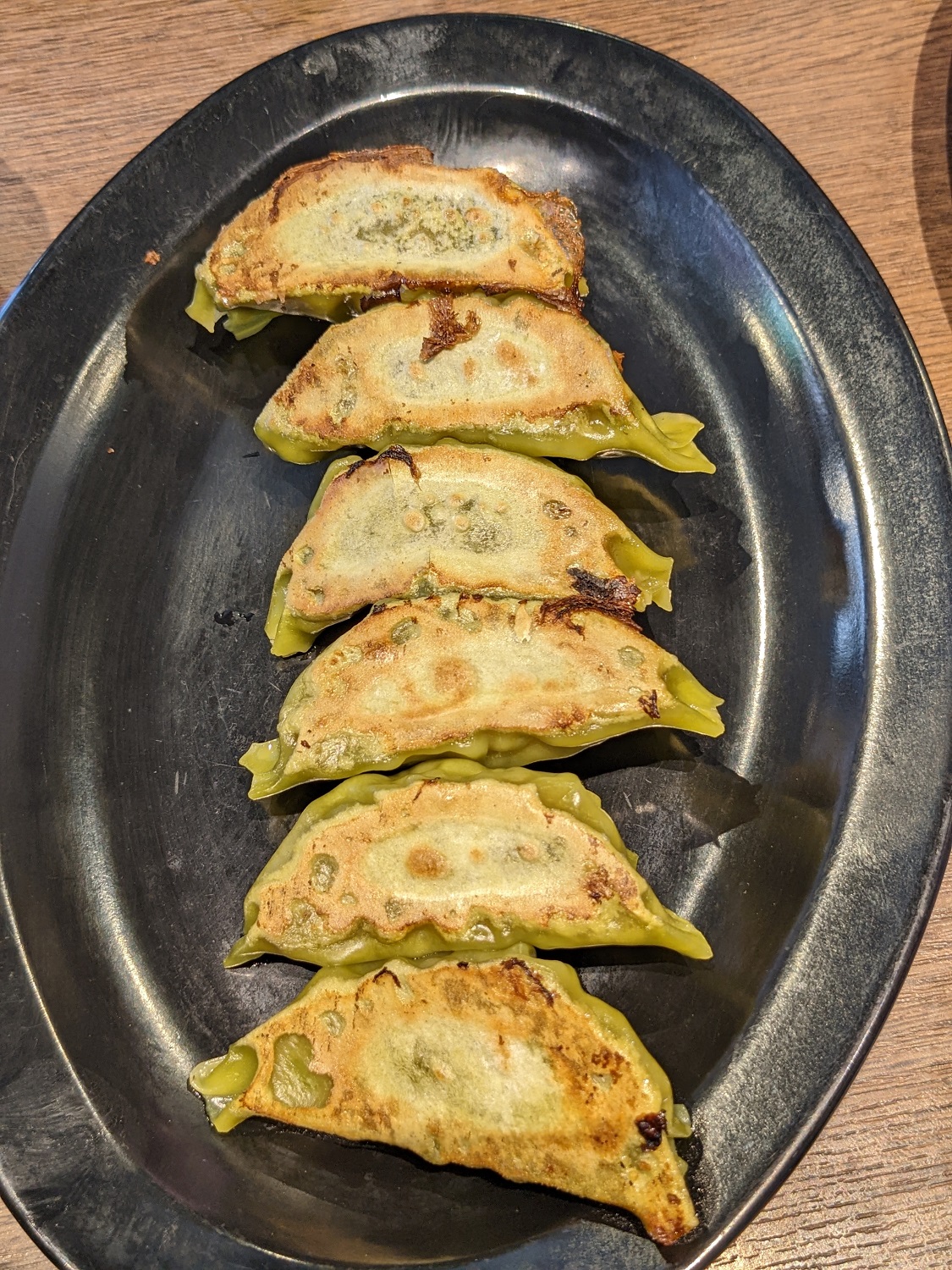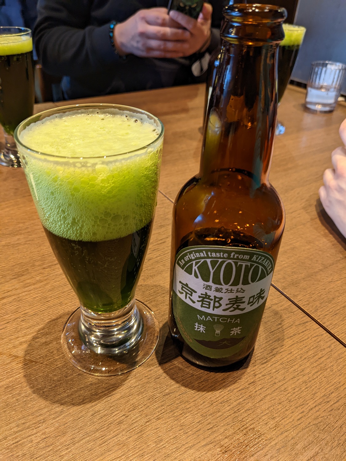 Langsam bekamen wir Hunger! Wir machten uns auf den Weg um ein Restaurant zu suchen. Dafür überquerten wir den Fluss über eine andere Brücke. Wir gingen in das Ramen-Restaurant, dass wir schon 2017 besuchten. Hier wurde Grüntee in den Ramennudeln und Gyoza verarbeitet. Auch gab es Grüntee-Bier.