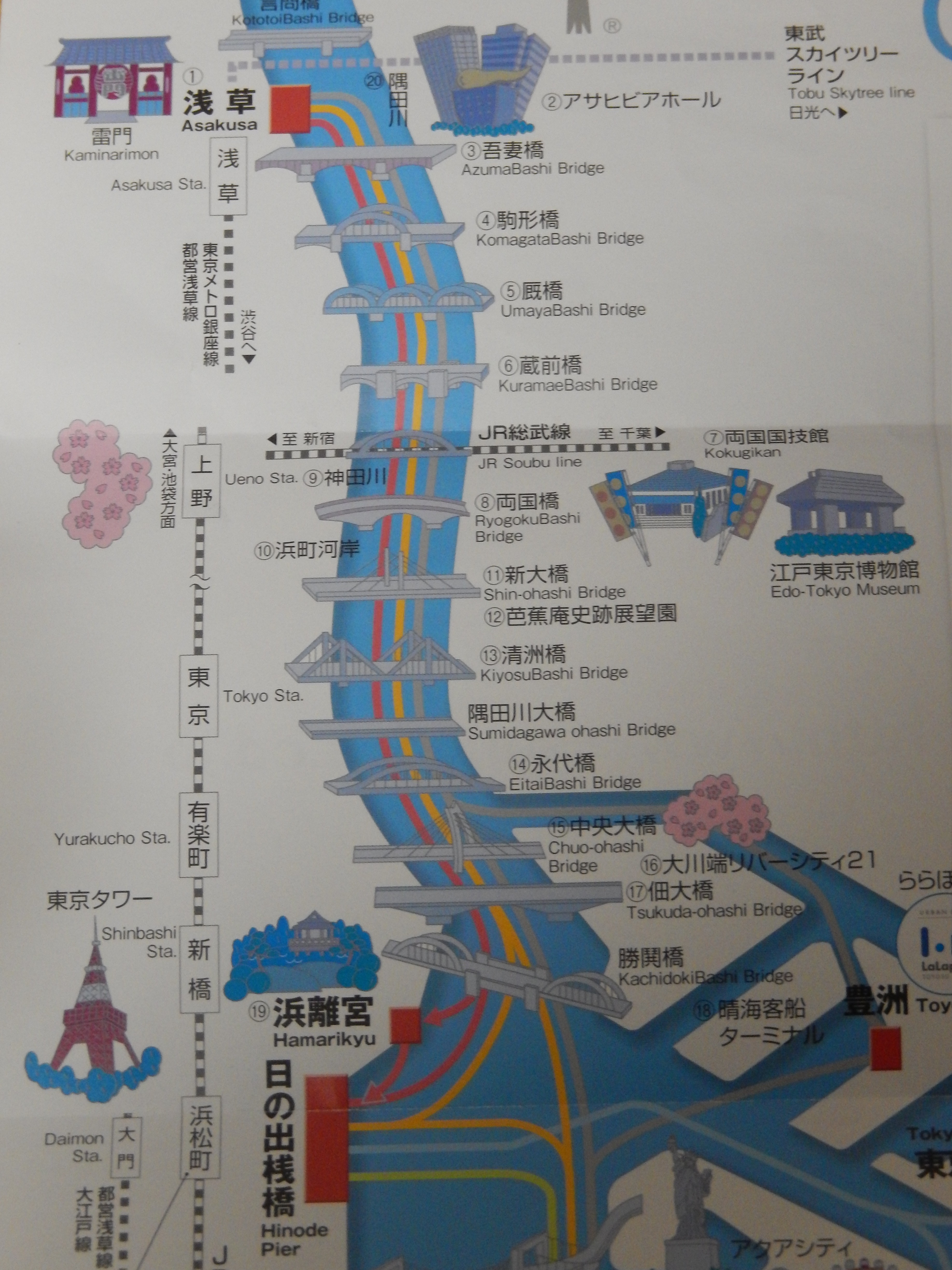 An meinem dritten Tag (27.12.2014) habe ich mir eine spezielle Route zusammen gestellt. Sie beginnt in Asakusa mit einem Boot, dann geht es zu Fuß zum Tokyo Tower und endet am Meiji Schrein. Ich bin an diesem Tag kurz nach neun Uhr losgelaufen zur Anlegestelle in Asakusa für Bootstouren. Die Bootstour war dreißig Minuten lang und es ist interessant sich Tokyo vom Wasser aus anzusehen. Außerdem war das Wetter für meine Tour ideal, keine einzige Wolke am Himmel 😀