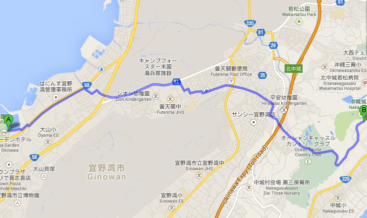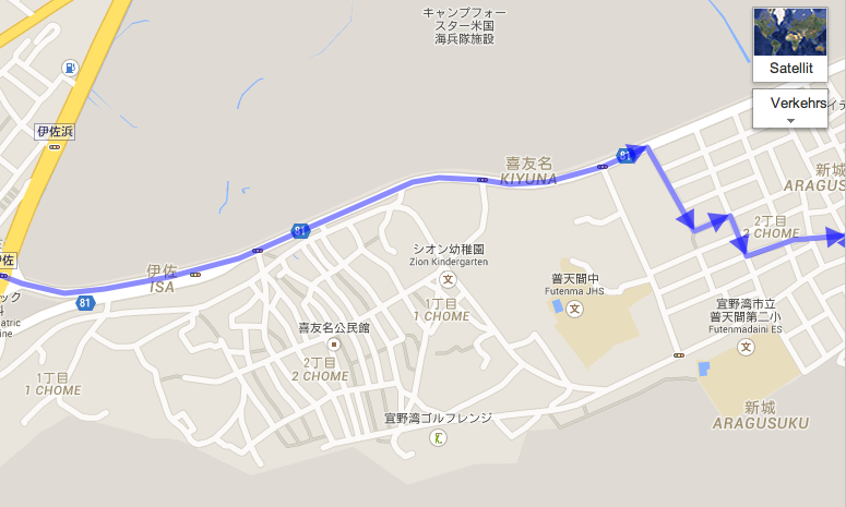An diesem Tag bin ich zur Steinburg Nakagusuku gewandert, dass war am Mittwoch den 28.01.2015. Da hatte ich mir ganz schön was vorgenommen, es waren ca. 8 km zur Burg hin und dann wieder zurück. Ich bin so zu sagen von der einen Seite der Insel zur anderen Seite gelaufen 🙂 Als ich losgegangen bin vom Hotel dachte ich schon, dass der Ausflug ins Wasser fallen würde da es angefangen hatte zu Regnen, aber der Regen ist dann ins Nieseln übergangen und während der Tour hatte es den ganz aufgehört. Bei meiner ersten Etappe war nicht viel zu sehen, ich bin dann nur noch schnell in ein Conbini gegangen und hatte mir Proviant für den Tag gekauft. Meine Orientierung sah dann so aus, dass ich mir das Kartenmaterial aus Google Maps geholt hatte (Ich hatte mir ein paar Screenshots gemacht, da ich kein mobiles Internet hatte).