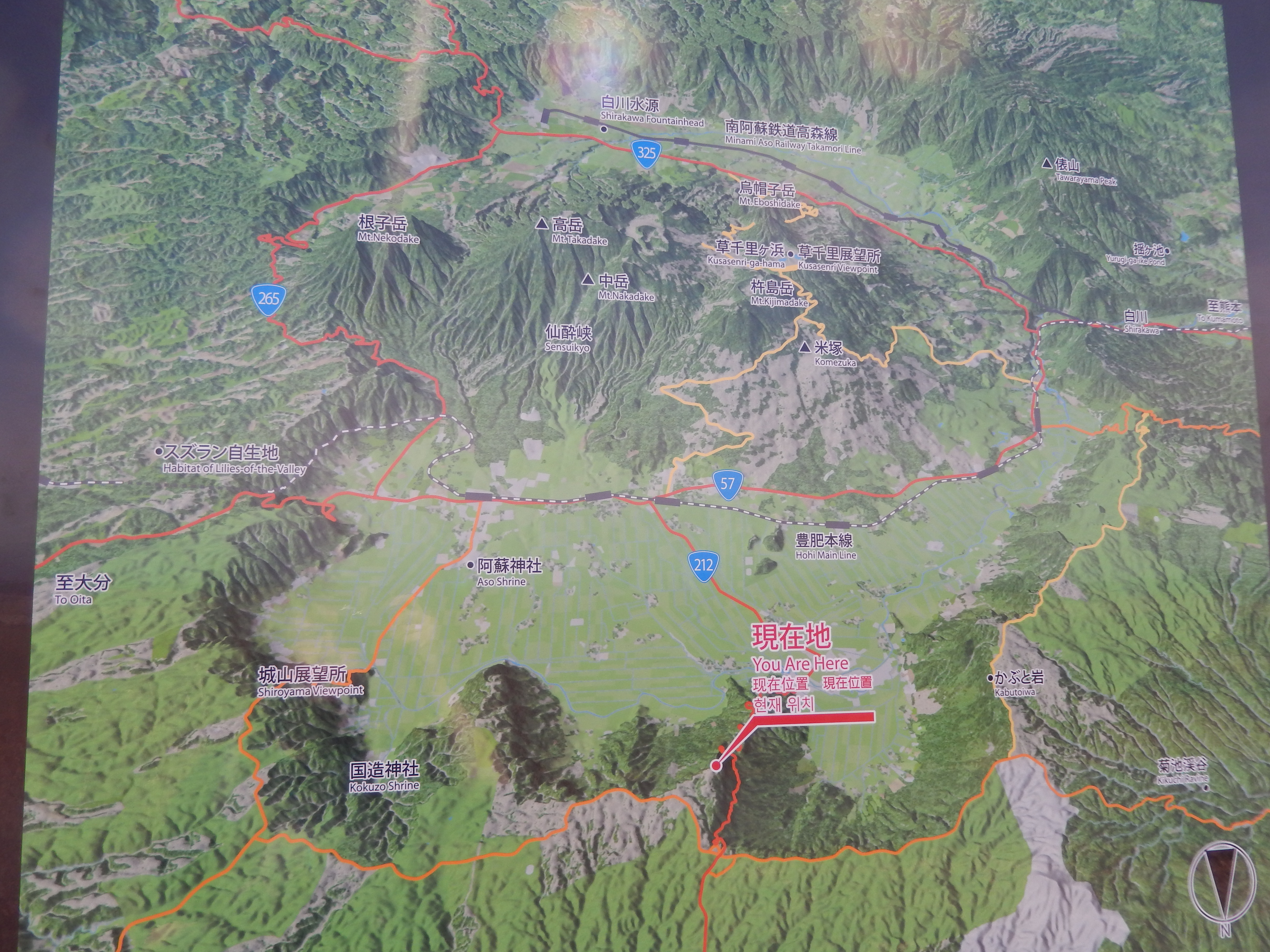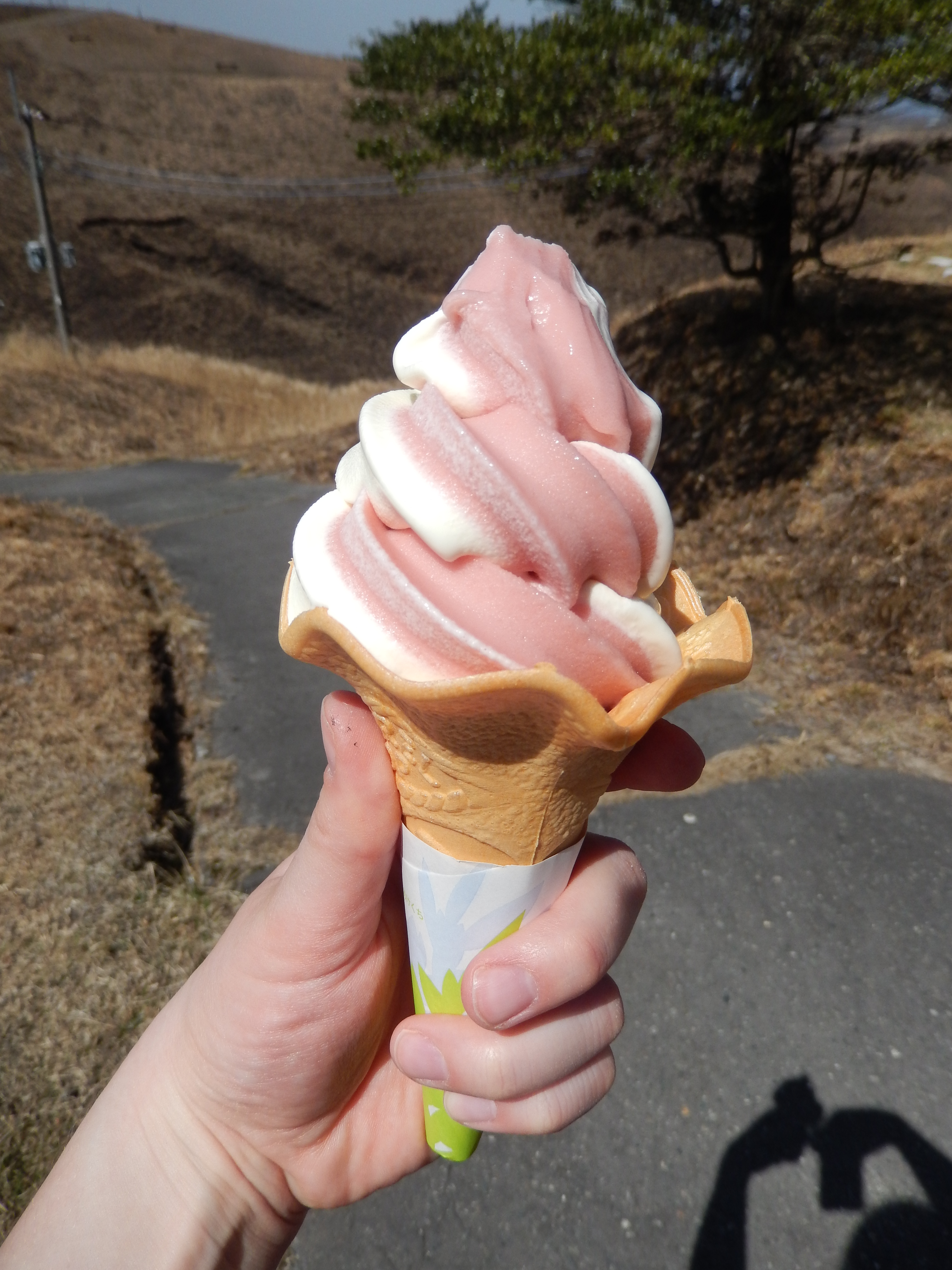Mein erster Morgen in Aso (17.03.2015) begann mit einem Japanischen Frühstück und der Vulkan Aso beglückte mich mit seinen Abgasen. Ich hatte schon Angst, dass ich den ganzen Tag nichts unternehmen kann. Nach dem Frühstück hat sich das ganze aber gelegt und ich konnte meine Tour zum Mount Daikanbo starten. Ich muss dazu aber sagen, das mich der Vulkan den ganzen Tag mit seinen Abgasen und kleinsten Asche Teilchen begleitet hat. Ich und mein fahrbares Gefährt waren immer mit einer kleinen Schicht aus Asche belegt. Mein Gefährt für diesen Tag war eine Fahrrad das ich mir vom Ryokan ausgeliehen hatte. Einziger Nachteil das Fahrrad hatte keine Gänge, dadurch ergab sich die Hinfahrt zum Mount Daikanbo etwas als schwierig. Da es hauptsächlich Berg auf ging, es ergab sich dann eine Mischung aus schieben und fahren.